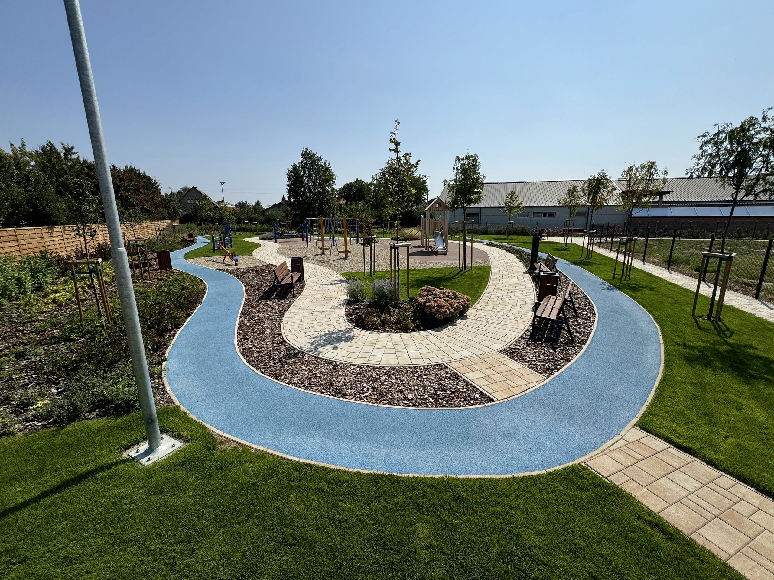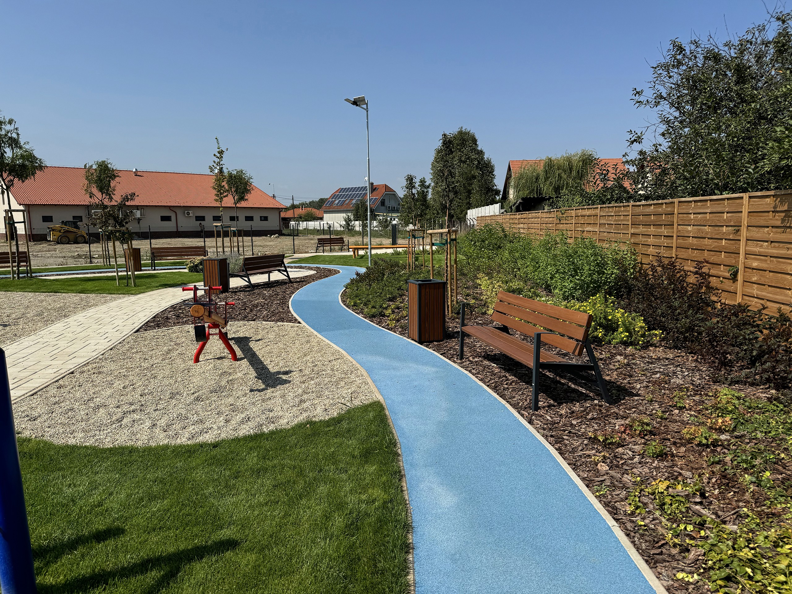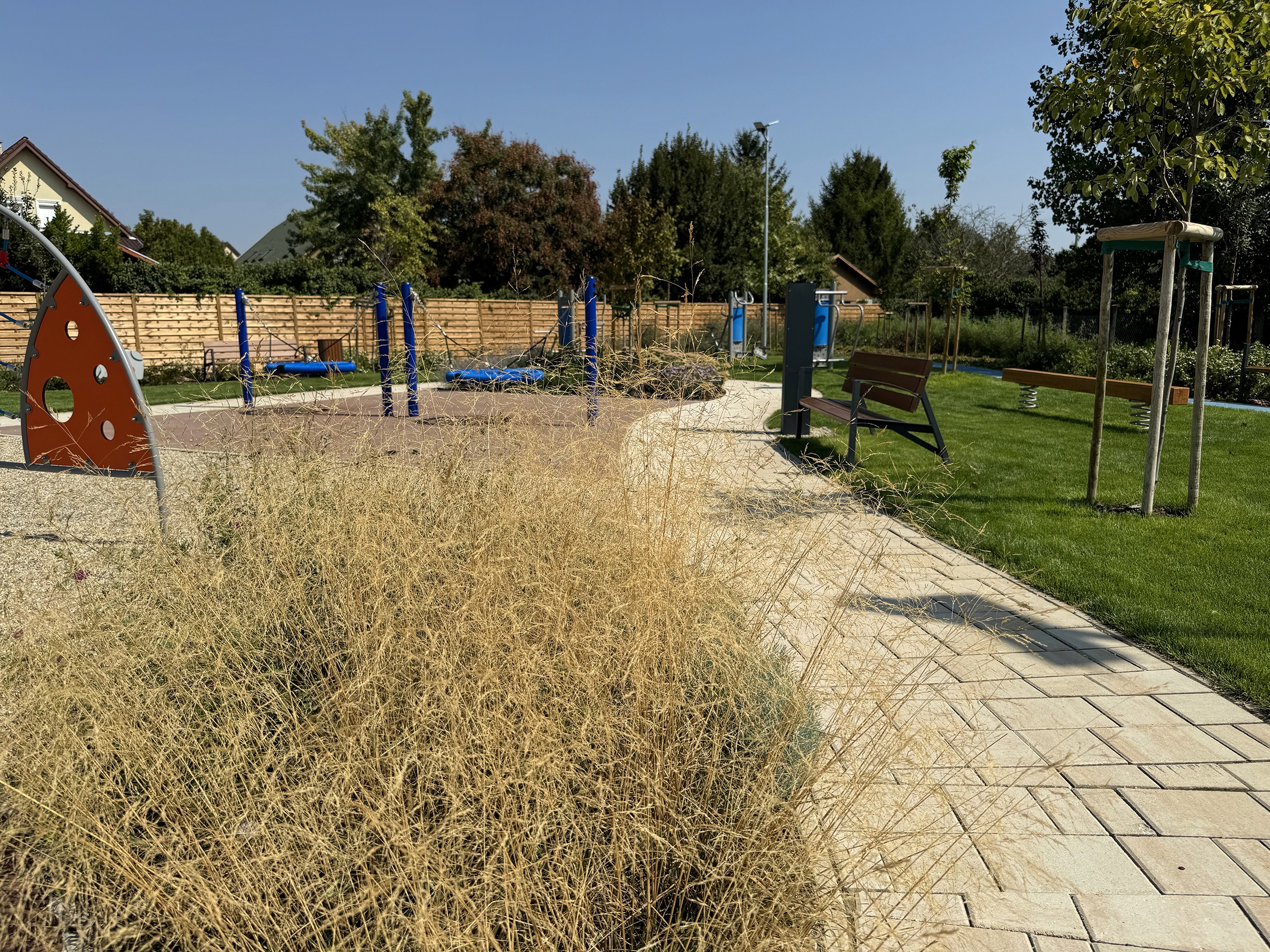 A Pihenőpark kialakítása során szerettünk volna egy olyan parkot tervezni, ahol nemcsak a gyerekeknek kedvezünk, hanem a sportolni vágyók igényeit is ki tudjuk elégíteni. Így kialakításra került egy 100 m hosszú gumiburkolatú futópálya is, ami a kültéri fitneszeszközök használata előtt helyet biztosít egy kis kocogáshoz, bemelegítéshez is. A játszóeszközök között már igen kis kortól egészen a 14 éves korosztályig megtalálhatók játékok. A növényhasználatnál fontos volt, hogy minidg legyen valami virágzó cserje vagy évelő, ezeket burkolatok mentén helyeztük el, így fontos volt, hogy semmikép ne kerüljön a növénylistába mérgező növény se. A telekhatár mentén egy sűrű takarást biztosító növénysáv kialakítása volt az igény, amit semmiképp sem szerettünk volna nyírott sövényként megjeleíteni, hanem ezt is inkább természetes formában, vegyes sövényként képzeltük el. A megfelelő árnyékolást számos, különböző fajú és fajtájú fák elhelyezésével biztosítottuk.