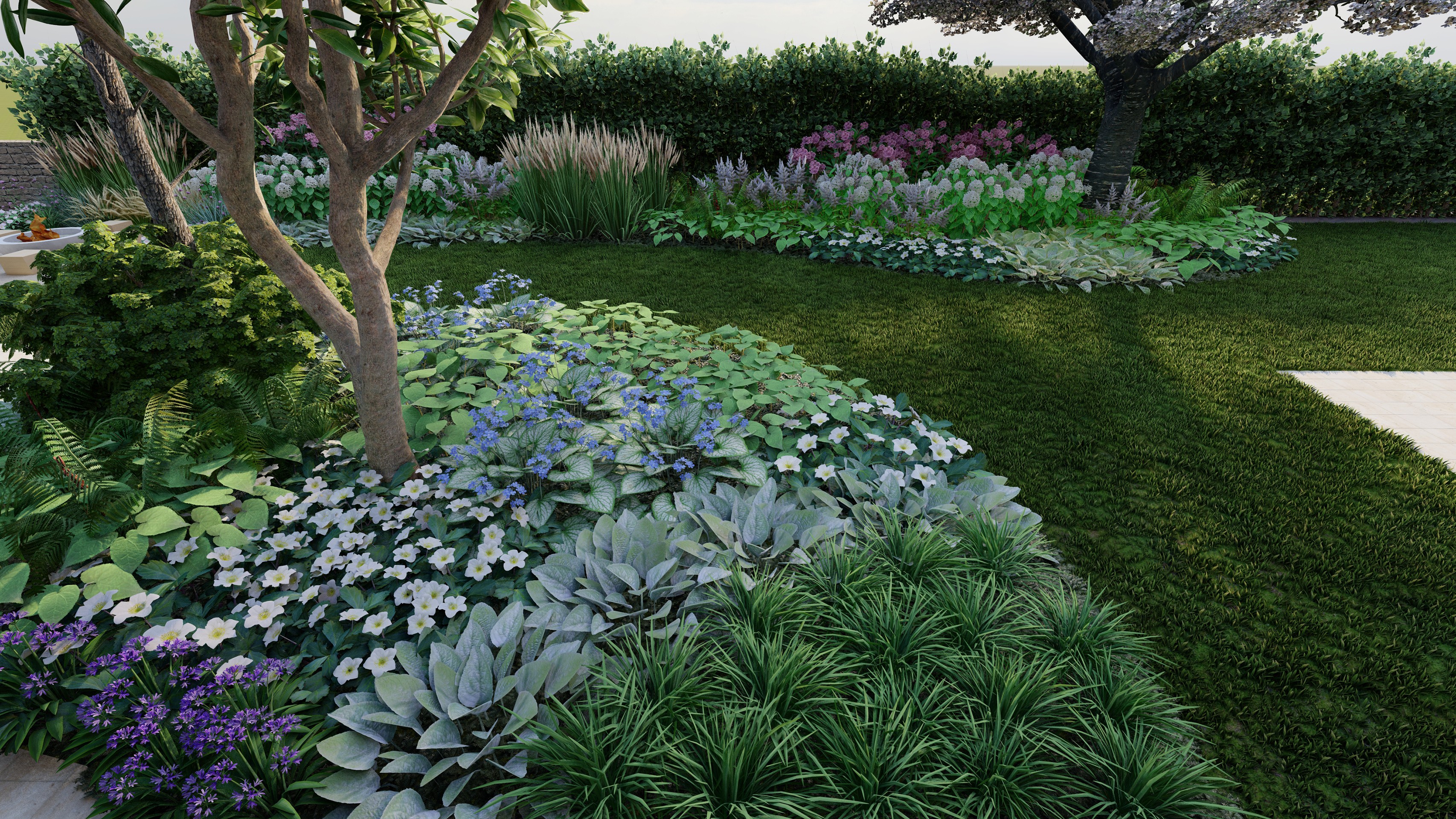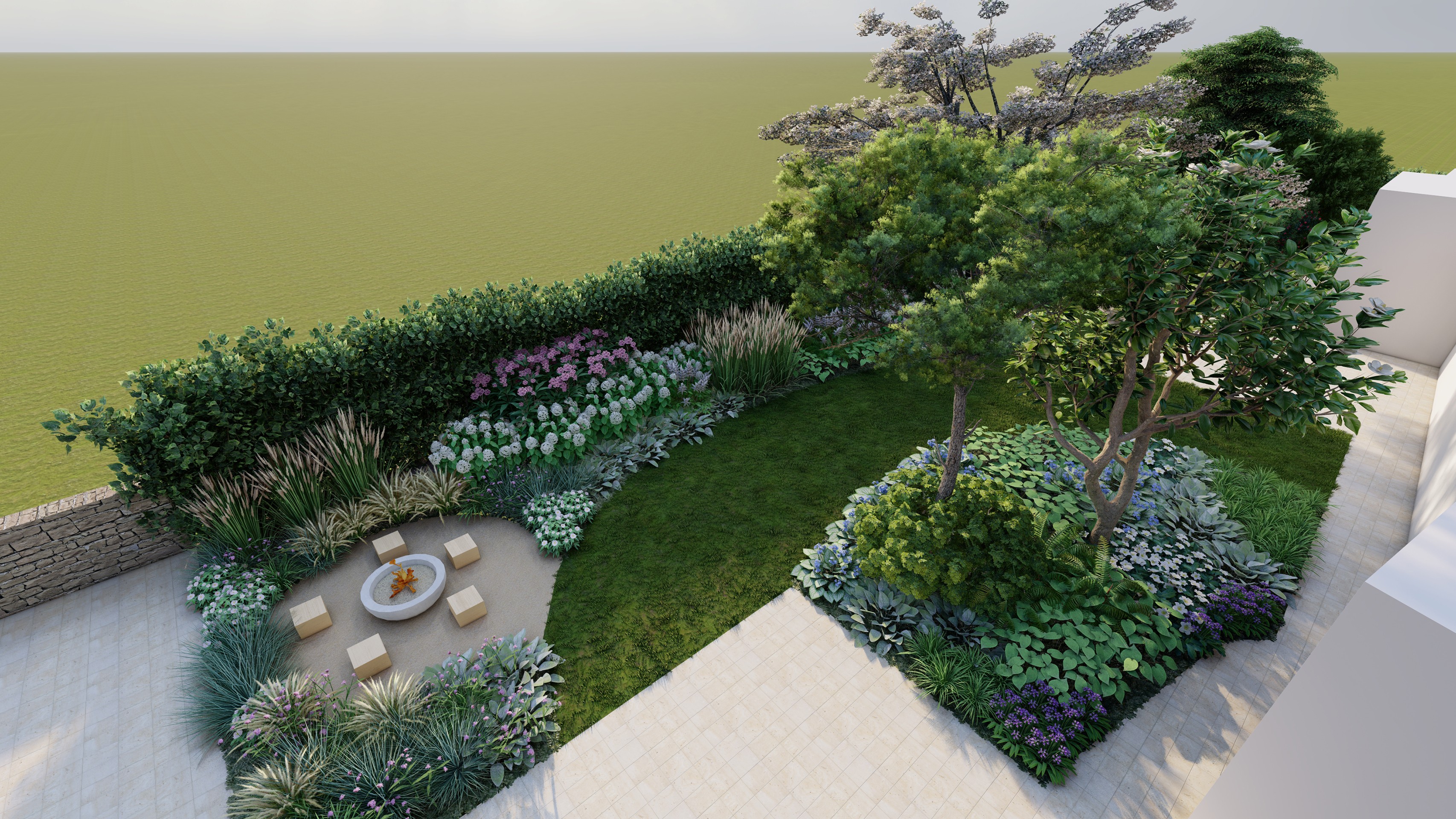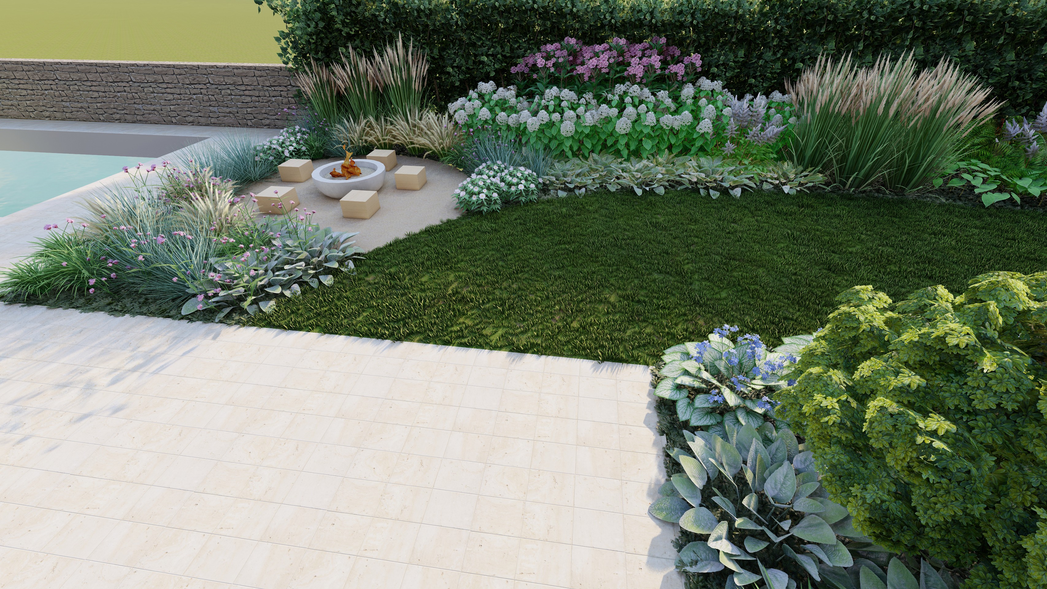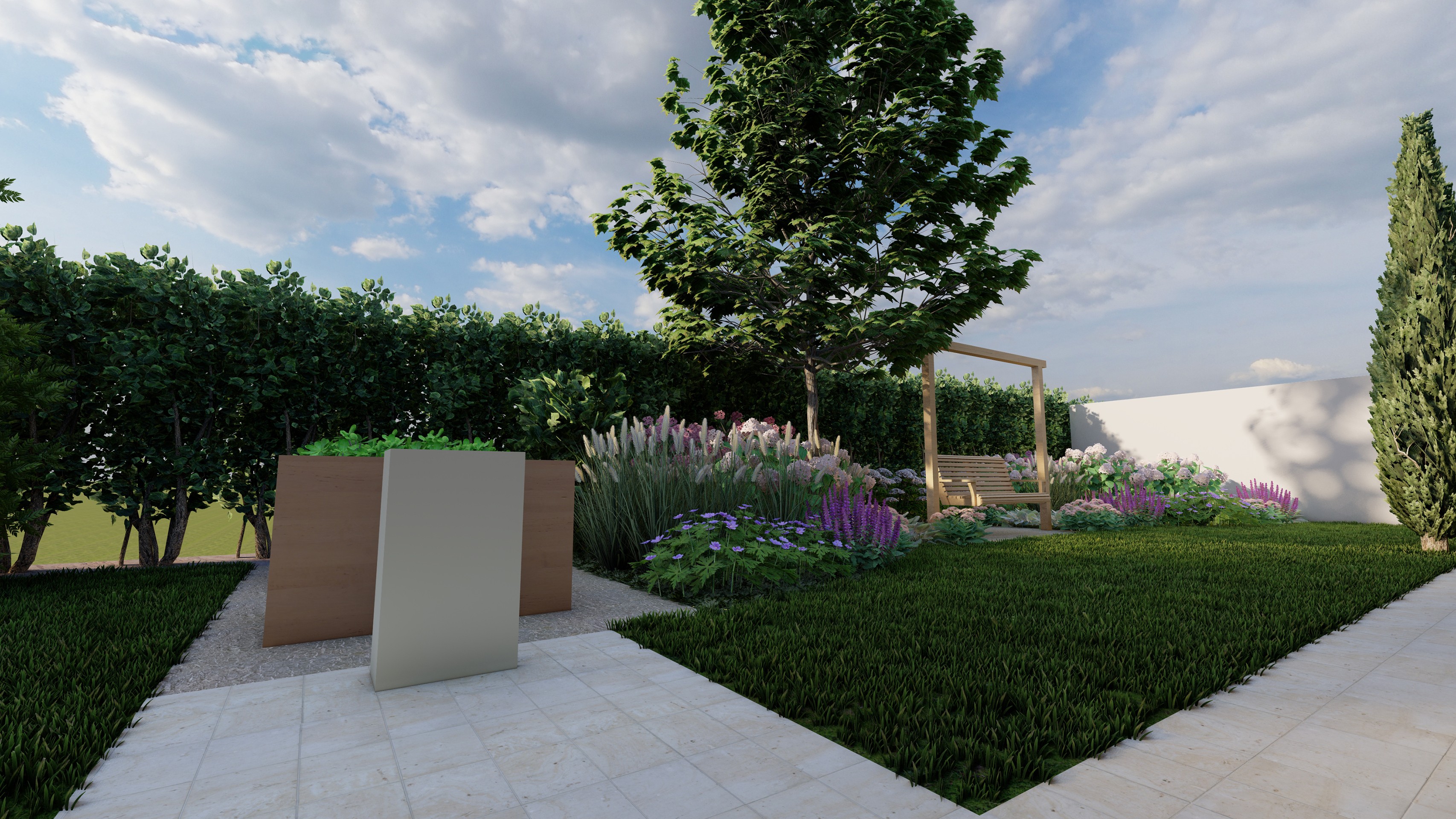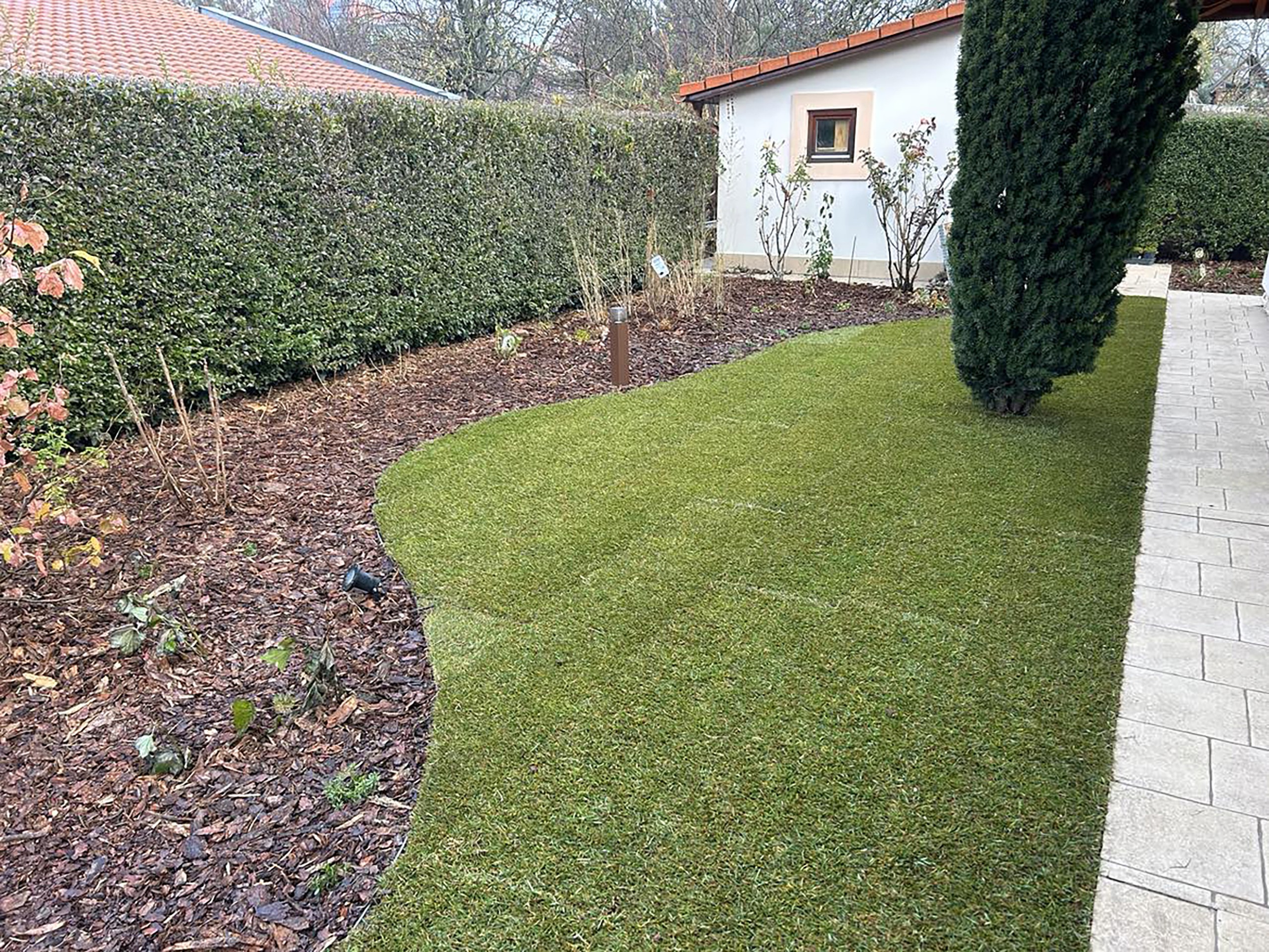 Nagy öröm számunkra, amikor egy olyan kertben dolgozhatunk ahol már van egy jól beállt fás szárú növényállomány, melyet fel tudunk díszíteni további cserjékkel, évelőkkel, így a friss telepítések mellett a meglévő koros egyedek is ki tudnak teljesedni és egy kerek egészet alkotnak. Megrendelőnk számára nagyon fontos volt a kerti világítás, így nagy hangsúlyt fektettünk rá, hogy elérjük a kívánt esti hangulatot. Alkalmaztunk alacsony fénypontú gyepbe rejtett spotokat, növényvilágító reflektorokat, magas fénypontó állólámpákat, és az évelők, cserjék közé rejtett világító pálcákat.