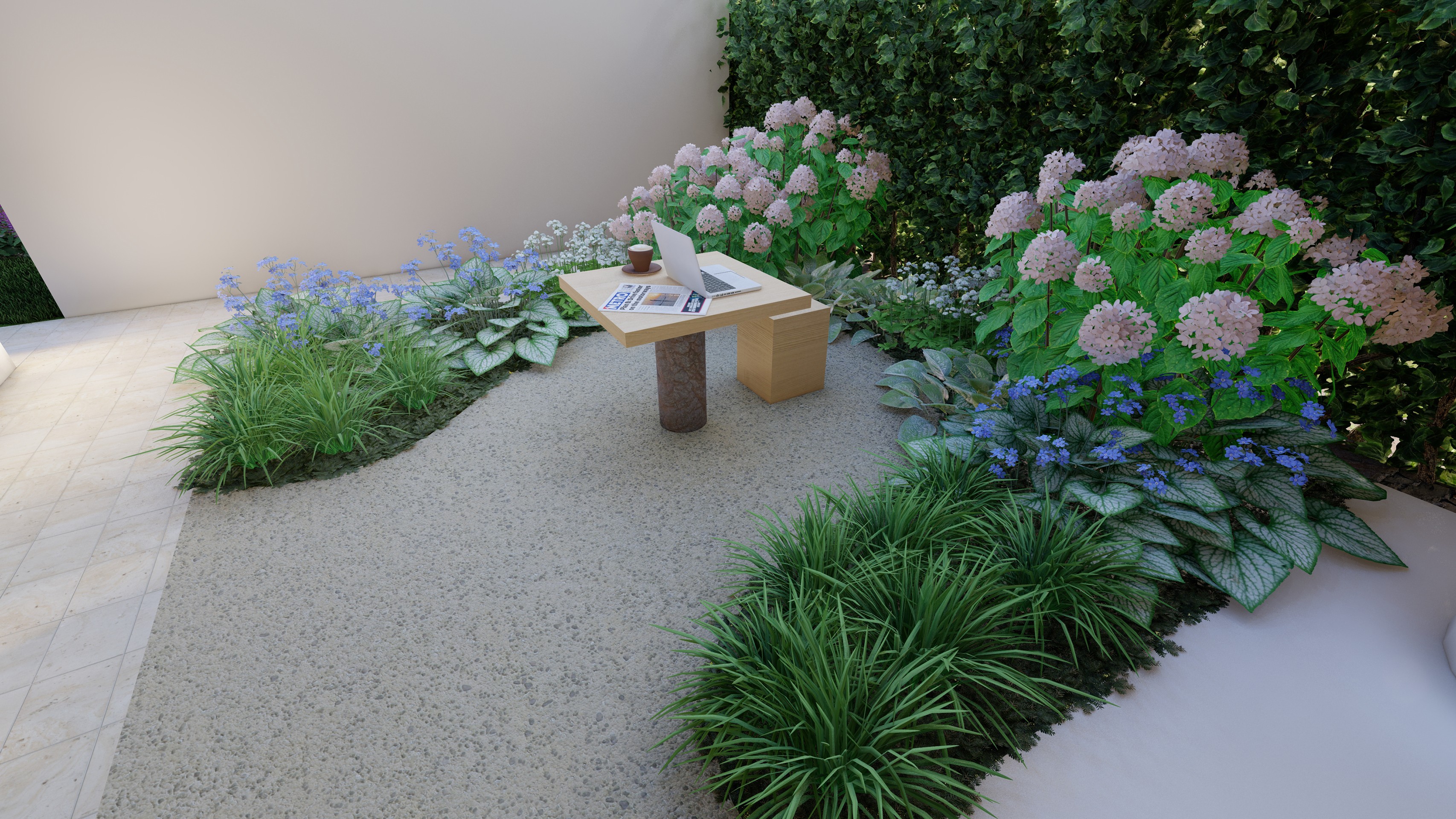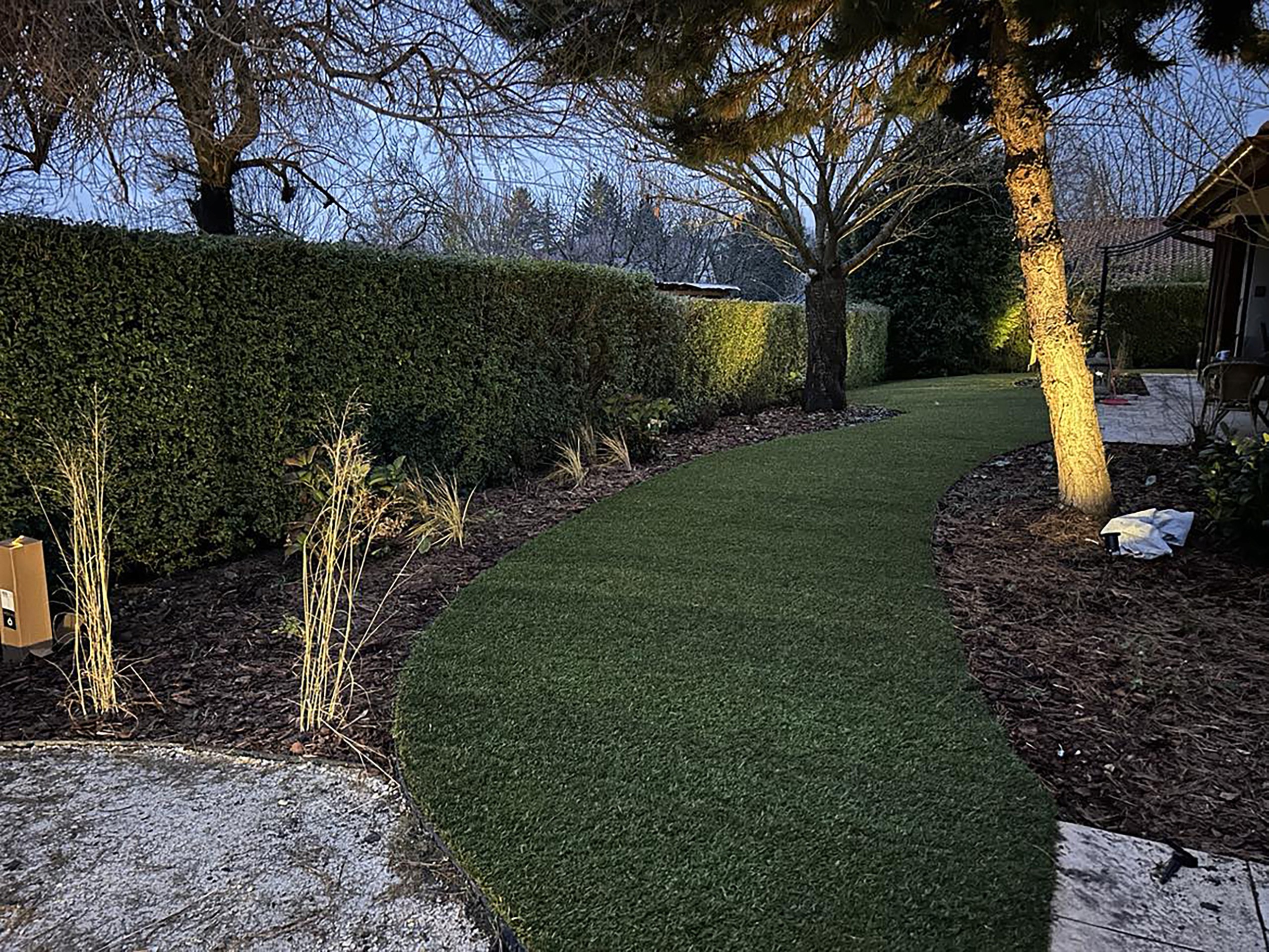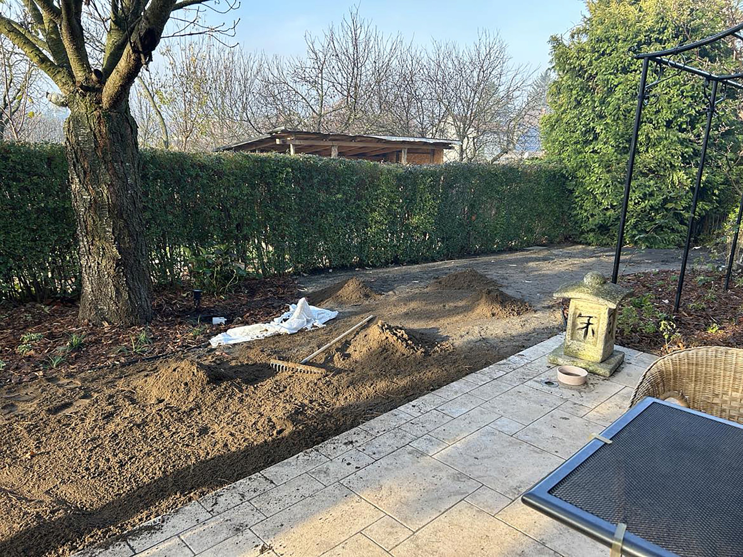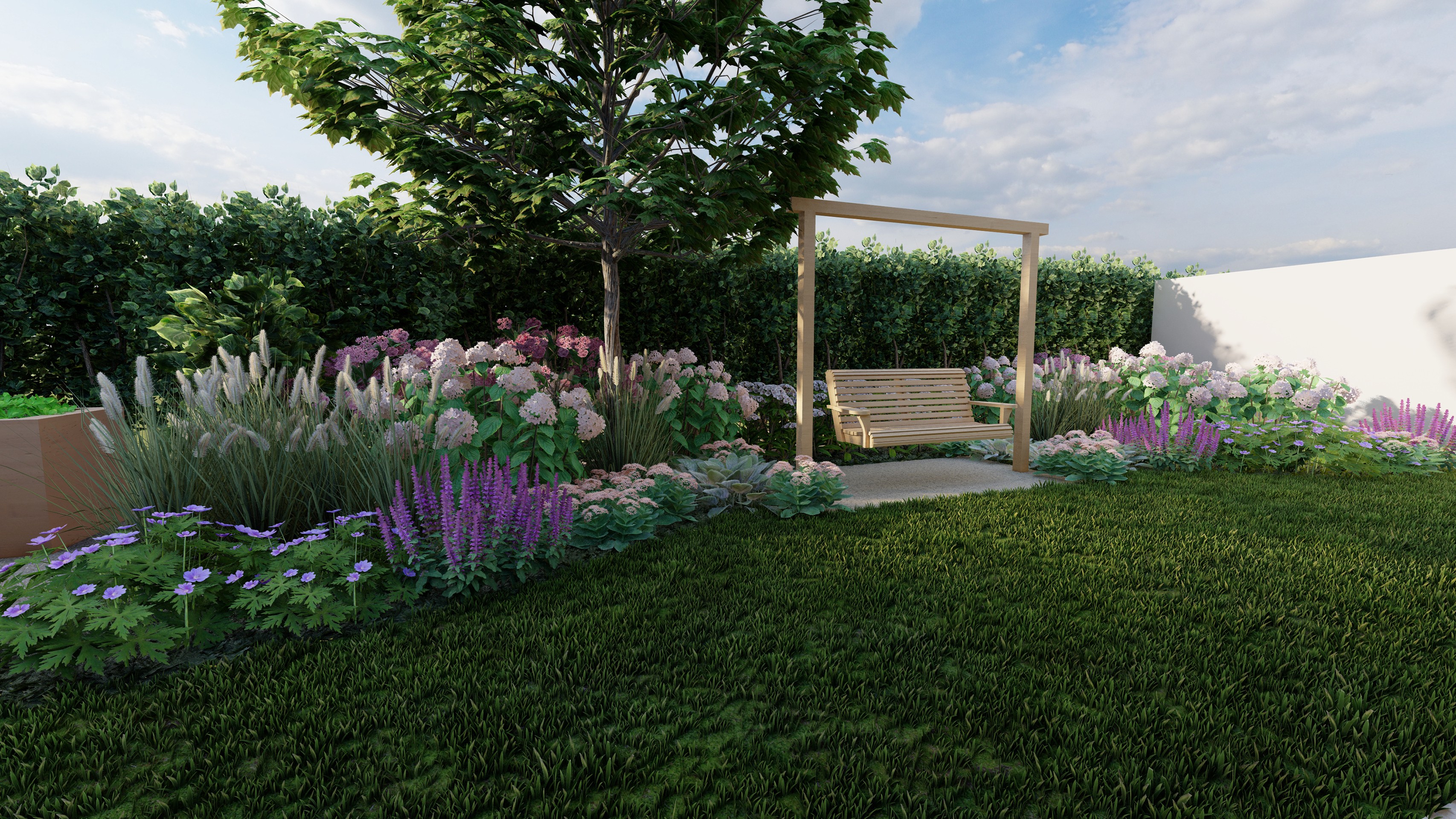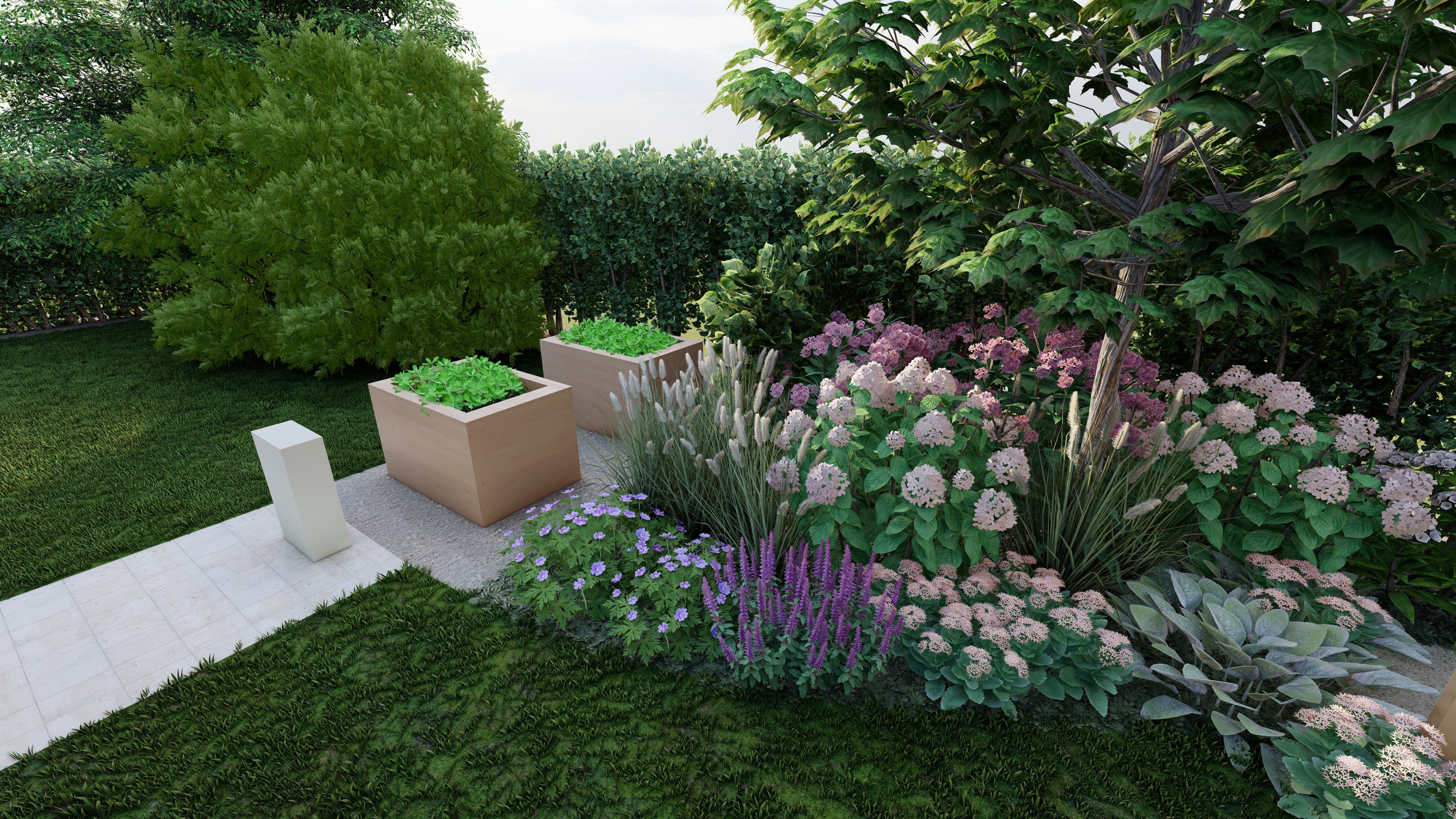Nagy öröm számunkra, amikor egy olyan kertben dolgozhatunk ahol már van egy jól beállt fás szárú növényállomány, melyet fel tudunk díszíteni további cserjékkel, évelőkkel, így a friss telepítések mellett a meglévő koros egyedek is ki tudnak teljesedni és egy kerek egészet alkotnak. Megrendelőnk számára nagyon fontos volt a kerti világítás, így nagy hangsúlyt fektettünk rá, hogy elérjük a kívánt esti hangulatot. Alkalmaztunk alacsony fénypontú gyepbe rejtett spotokat, növényvilágító reflektorokat, magas fénypontó állólámpákat, és az évelők, cserjék közé rejtett világító pálcákat.