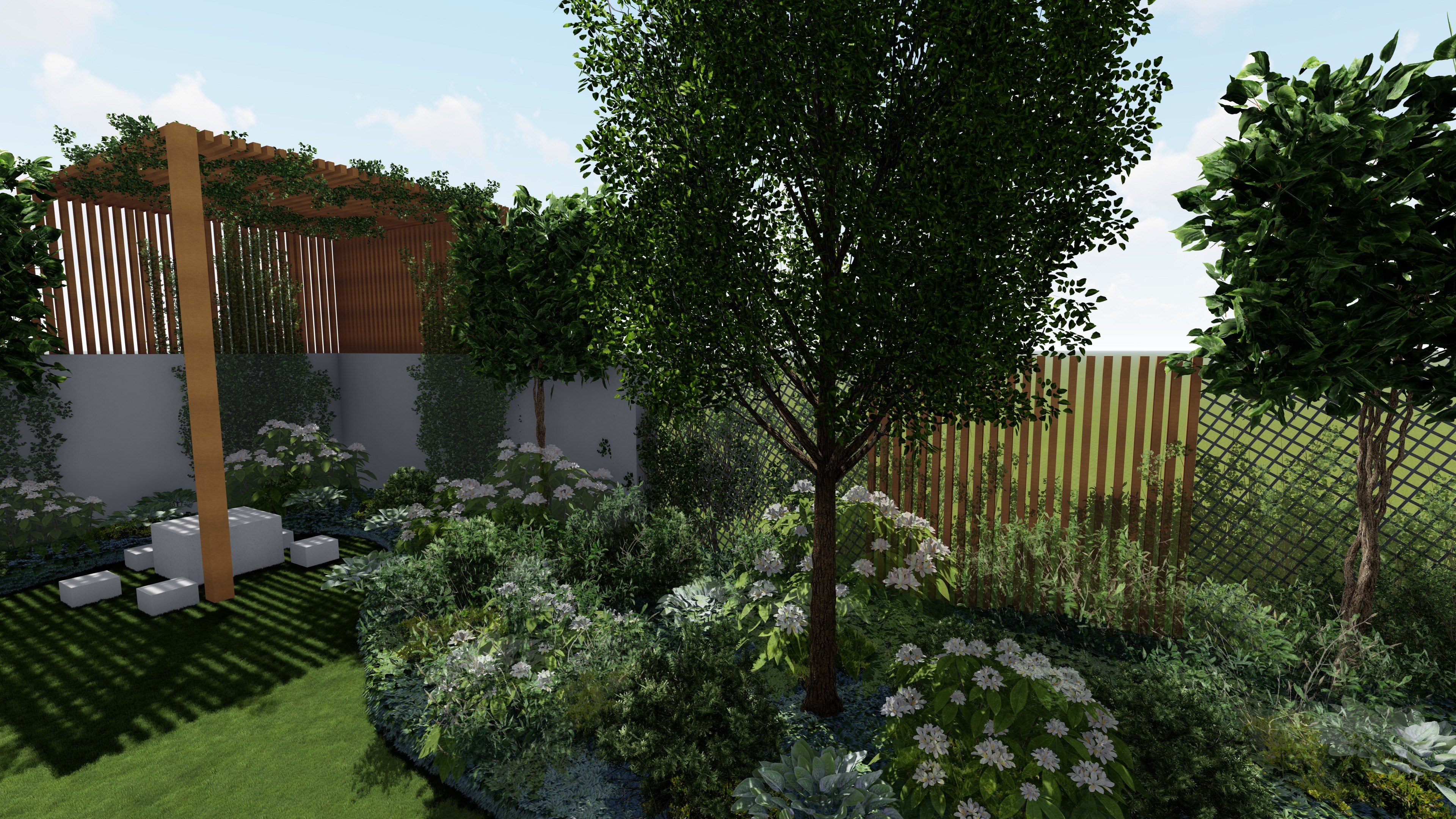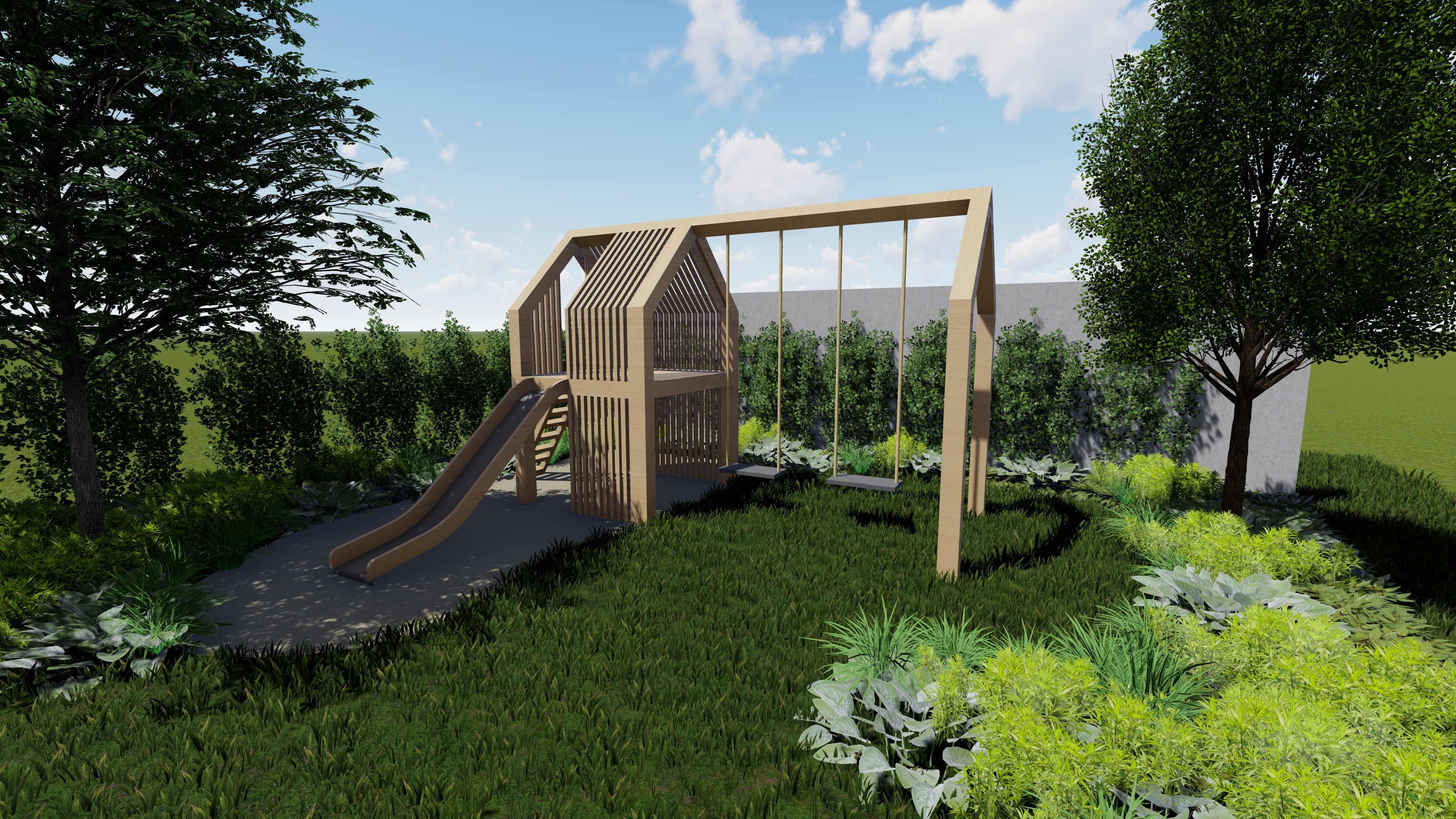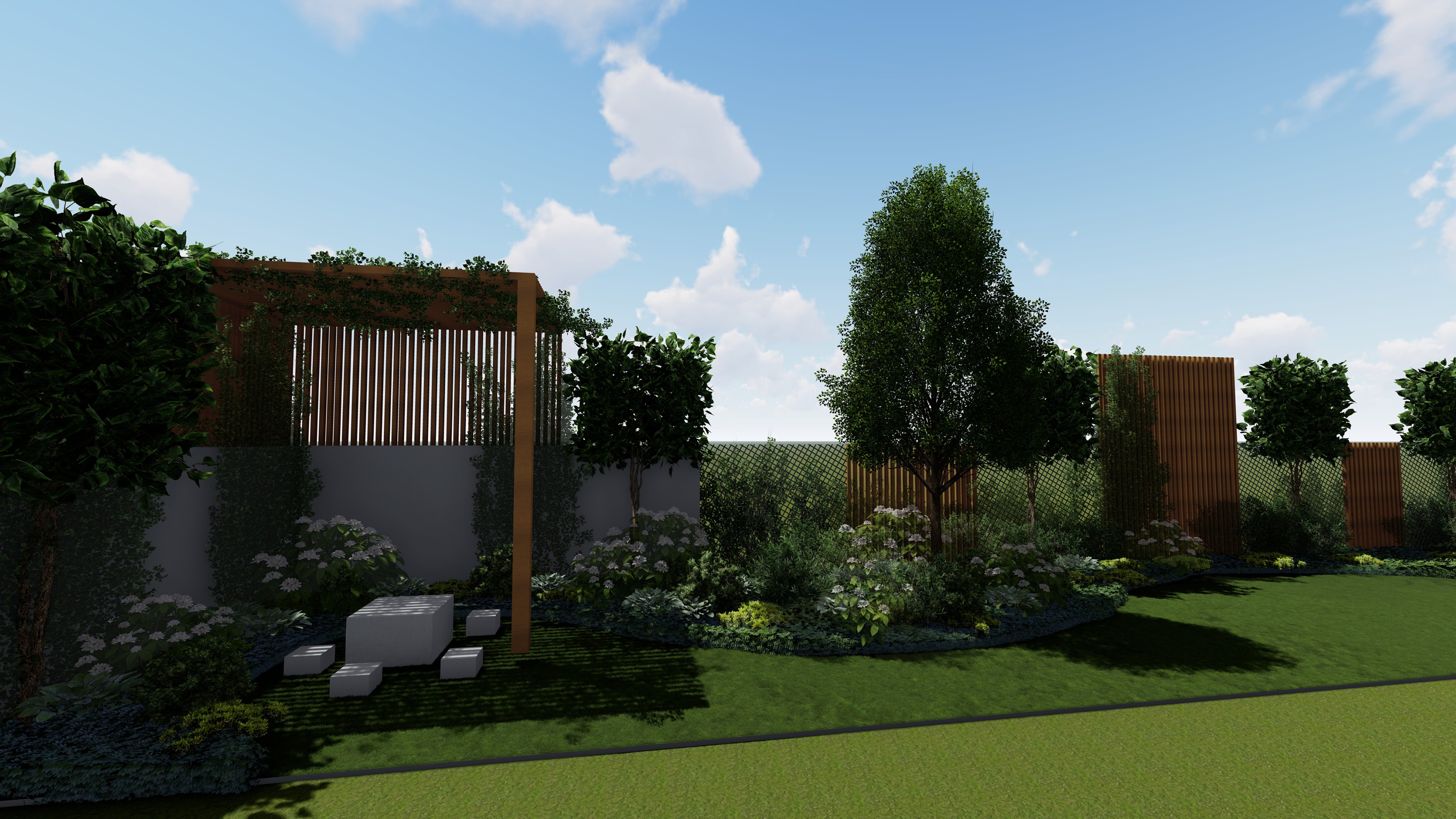 A kert tervezésekor, mint minden esetben nagy hangsúlyt fektettünk az elhelyezkedésére, környezetre, a legnagyobb probléma a hátsó szomszéd falának kitakarása volt, ugyanis egy magas romos épületet kellett elrejtenünk egy összetett támrendszerrel. A takarást fa felületek, és acél növény futtató rendszerek váltakozásával oldottuk meg, melyek nem zárják le hermetikusan a teret, mégis takarján a nem kívánt látványt. A család igénye továbbá egy játszósarok volt, ahova egy egyedi tervezésű fa játszószer került elhelyezésre.