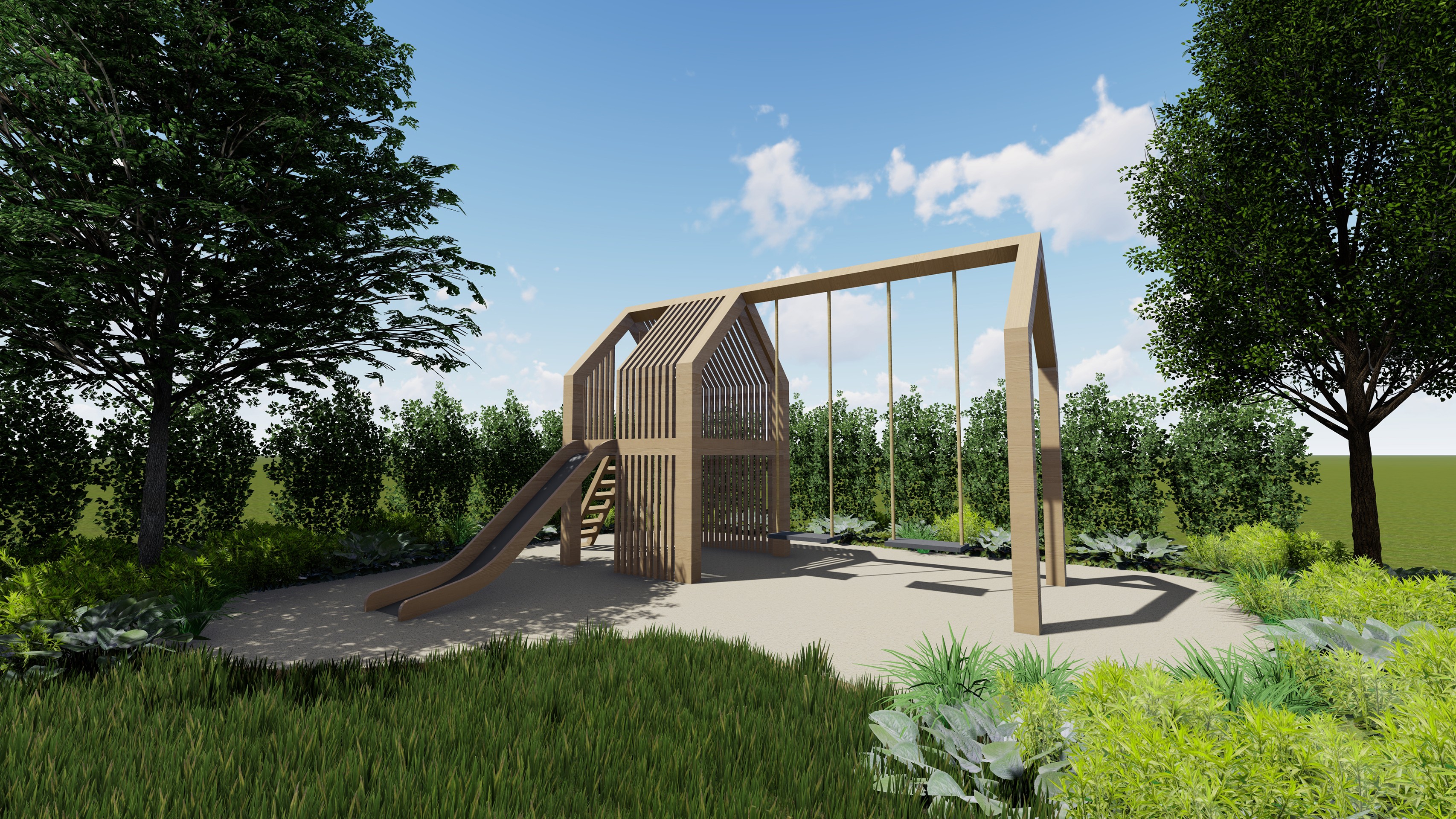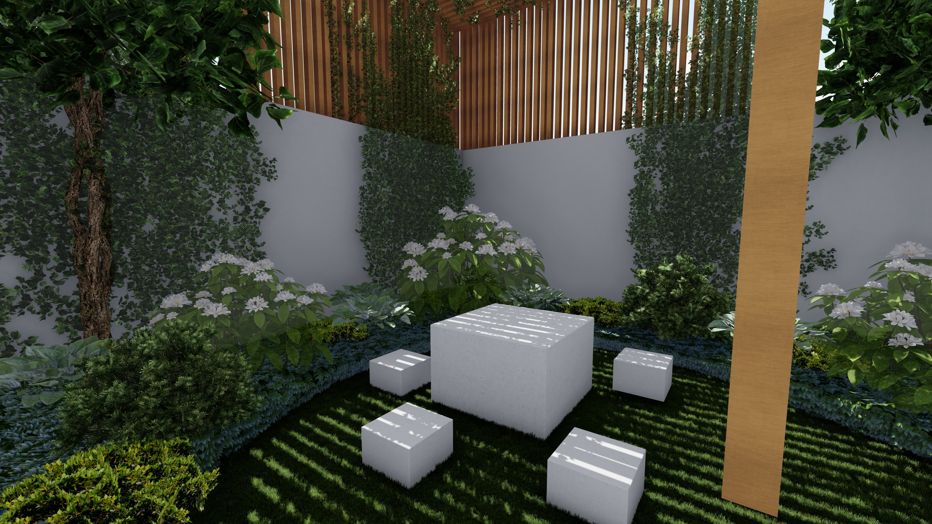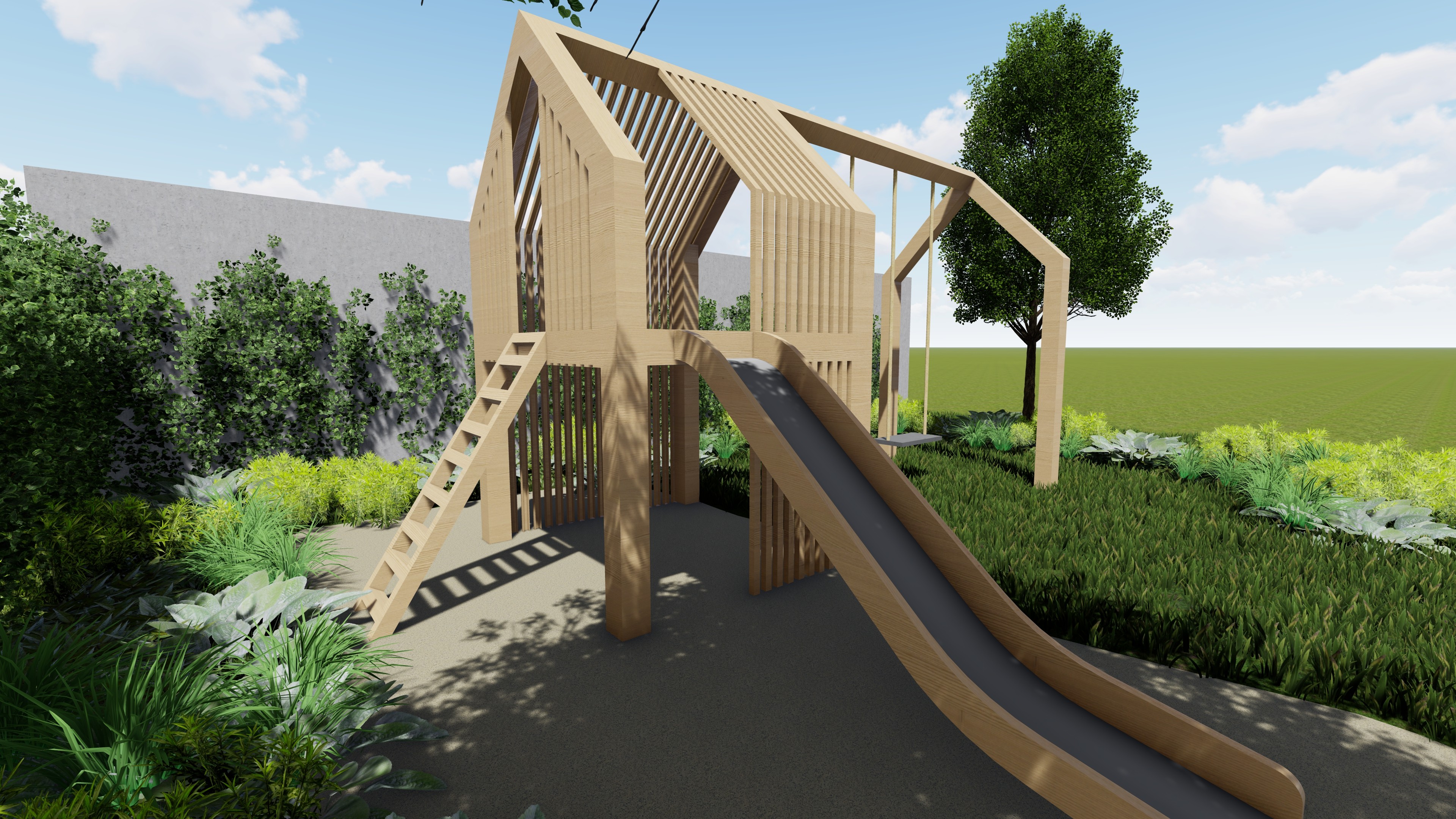 A kert tervezésekor, mint minden esetben nagy hangsúlyt fektettünk az elhelyezkedésére, környezetre, a legnagyobb probléma a hátsó szomszéd falának kitakarása volt, ugyanis egy magas romos épületet kellett elrejtenünk egy összetett támrendszerrel. A takarást fa felületek, és acél növény futtató rendszerek váltakozásával oldottuk meg, melyek nem zárják le hermetikusan a teret, mégis takarján a nem kívánt látványt. A család igénye továbbá egy játszósarok volt, ahova egy egyedi tervezésű fa játszószer került elhelyezésre.