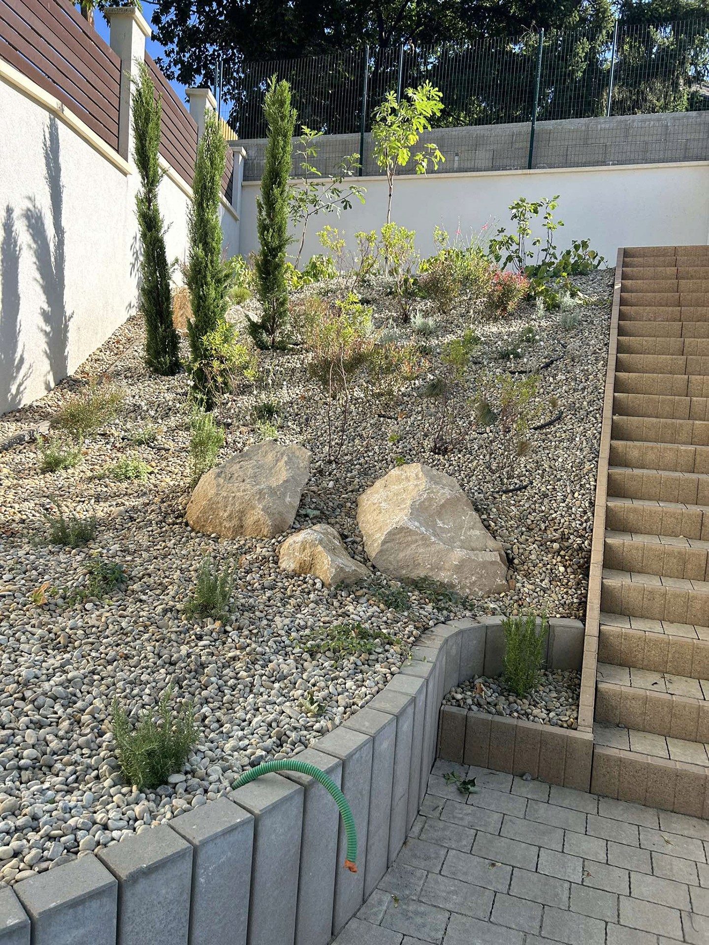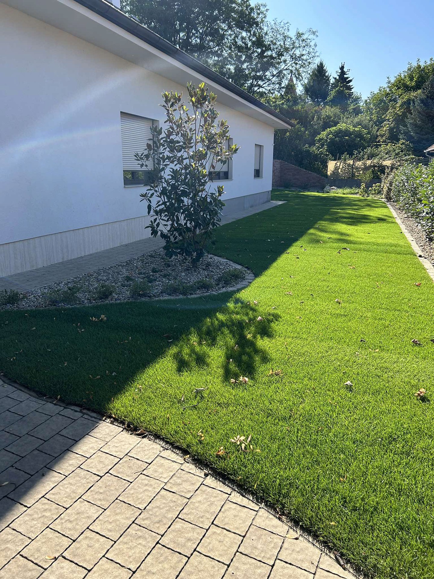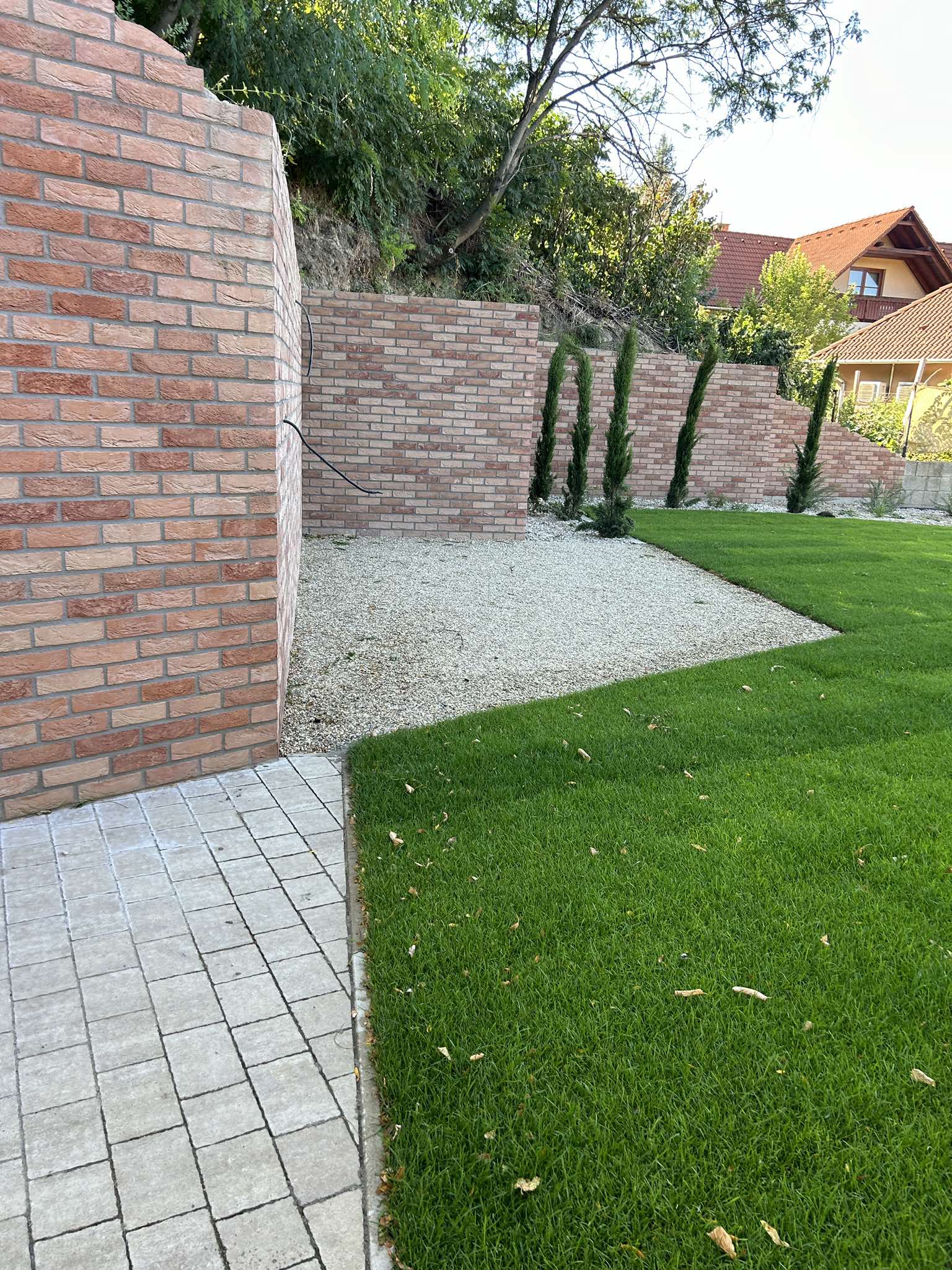 A megrendelő igénye egy olyan kert volt, ami minimális fenntartással is hosszú évekig megteremti neki a tökéletes környezetet a kert több funkciós használatához. A kert igen különleges elhelyezkedésű, megtalálható benne igen napos, meredek rézsűs terület, árnyékos kissé intimebb hangulatú belső udvarrész és szinte vízszintes napos hátsókert. A gyepfelületeket virágzó, vegyes évelőágyásokkal, talajtakaró cserjékkel szegélyeztük, a kemence környékére a megrendelő kedvéért különböző fűszernövényket helyeztünk el, hogy minidg kéznél legyenek, mikor szükség van rájuk.