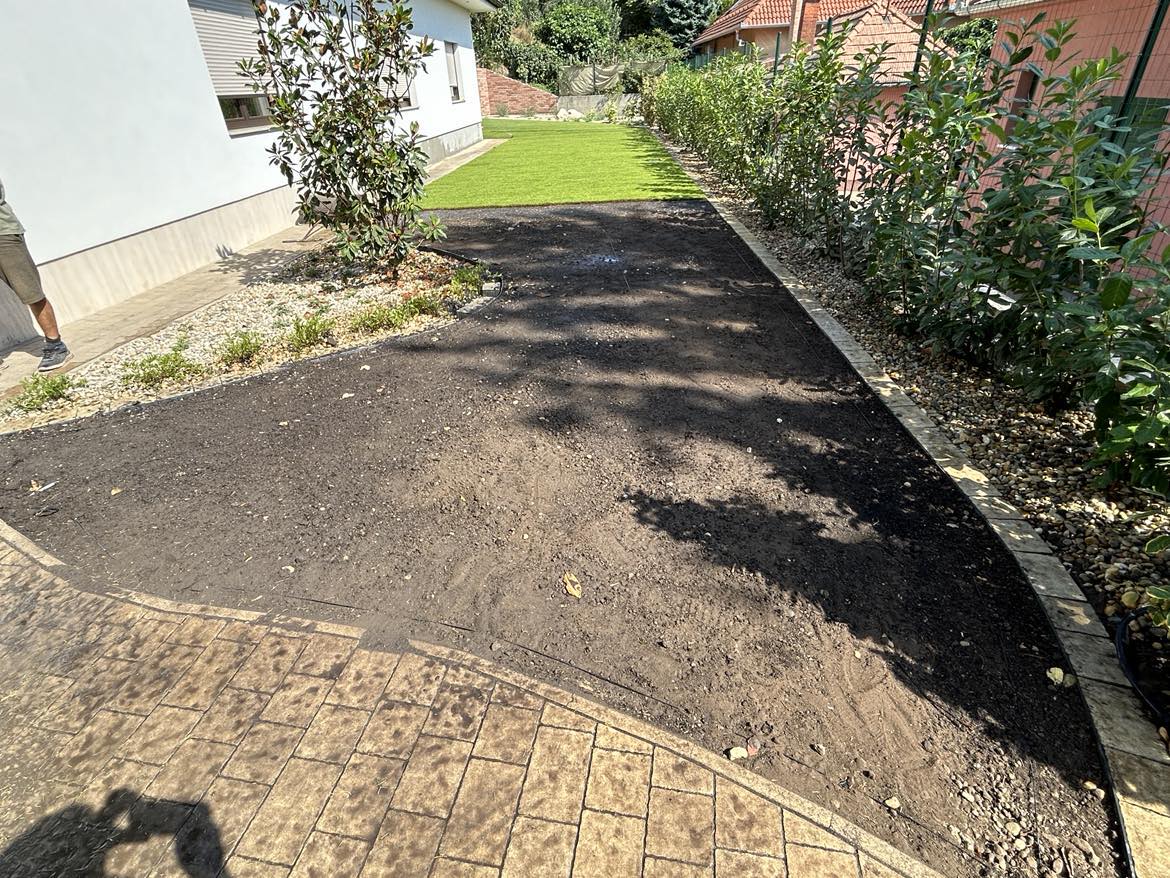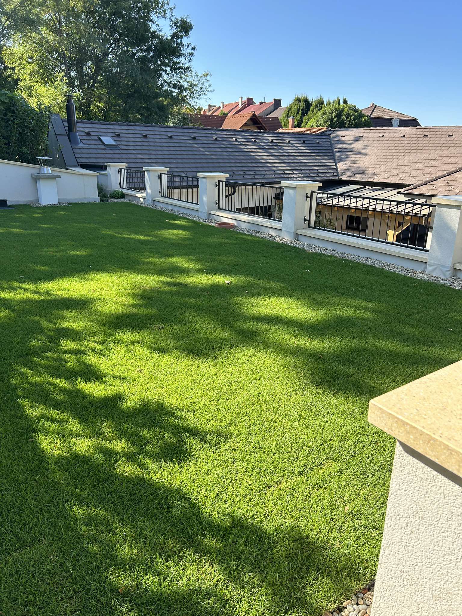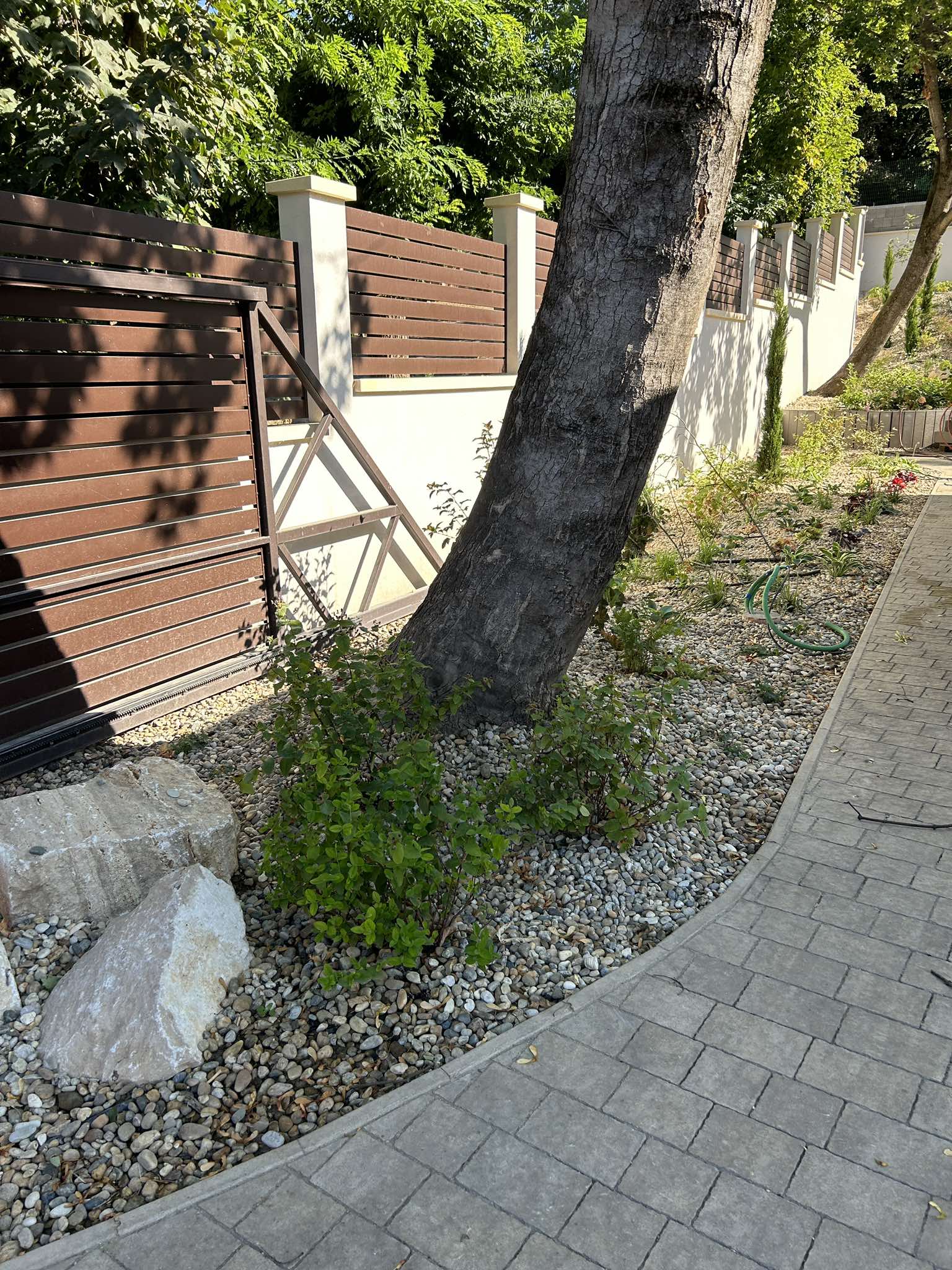 A megrendelő igénye egy olyan kert volt, ami minimális fenntartással is hosszú évekig megteremti neki a tökéletes környezetet a kert több funkciós használatához. A kert igen különleges elhelyezkedésű, megtalálható benne igen napos, meredek rézsűs terület, árnyékos kissé intimebb hangulatú belső udvarrész és szinte vízszintes napos hátsókert. A gyepfelületeket virágzó, vegyes évelőágyásokkal, talajtakaró cserjékkel szegélyeztük, a kemence környékére a megrendelő kedvéért különböző fűszernövényket helyeztünk el, hogy minidg kéznél legyenek, mikor szükség van rájuk.